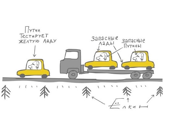 Я предлагаю гораздо более простое объяснение: Путин ездил, потому что в кайф. Потому что крутые пацаны и отдыхают круто. Это всякие идиоты вроде Обамы, Ден Сяопина или там Саакашвили строят дороги. А крутые пацаны ездят по бездорожью. Кто еще в мире может позволить себе в полной безопасности, сопровождаемый десятком крутых машин, (и парой желтых «Лад» в запасе) проехаться по стране, выстроив в кустах не рояли, а министров и олигархов, рвущихся поговорить с хозяином. (А дорогу, заметим, так и не заморочились построить, даже не заморочились объявить: нет в России в XXI веке сквозной асфальтированной дороги от Москвы до Владивостока, хотя Путин обещал, что она появится к 2008-му году).